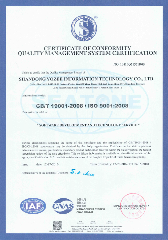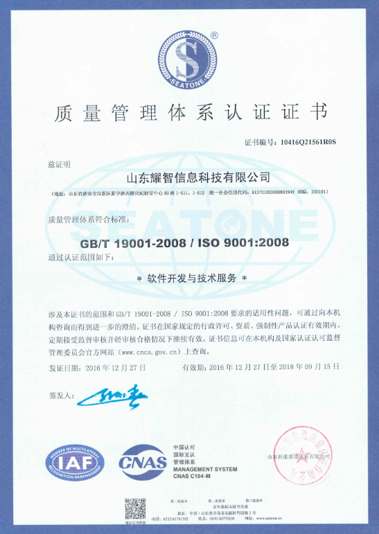山東耀智信息科技順利通過 ISO9001:2008質(zhì)量管理體系認證